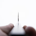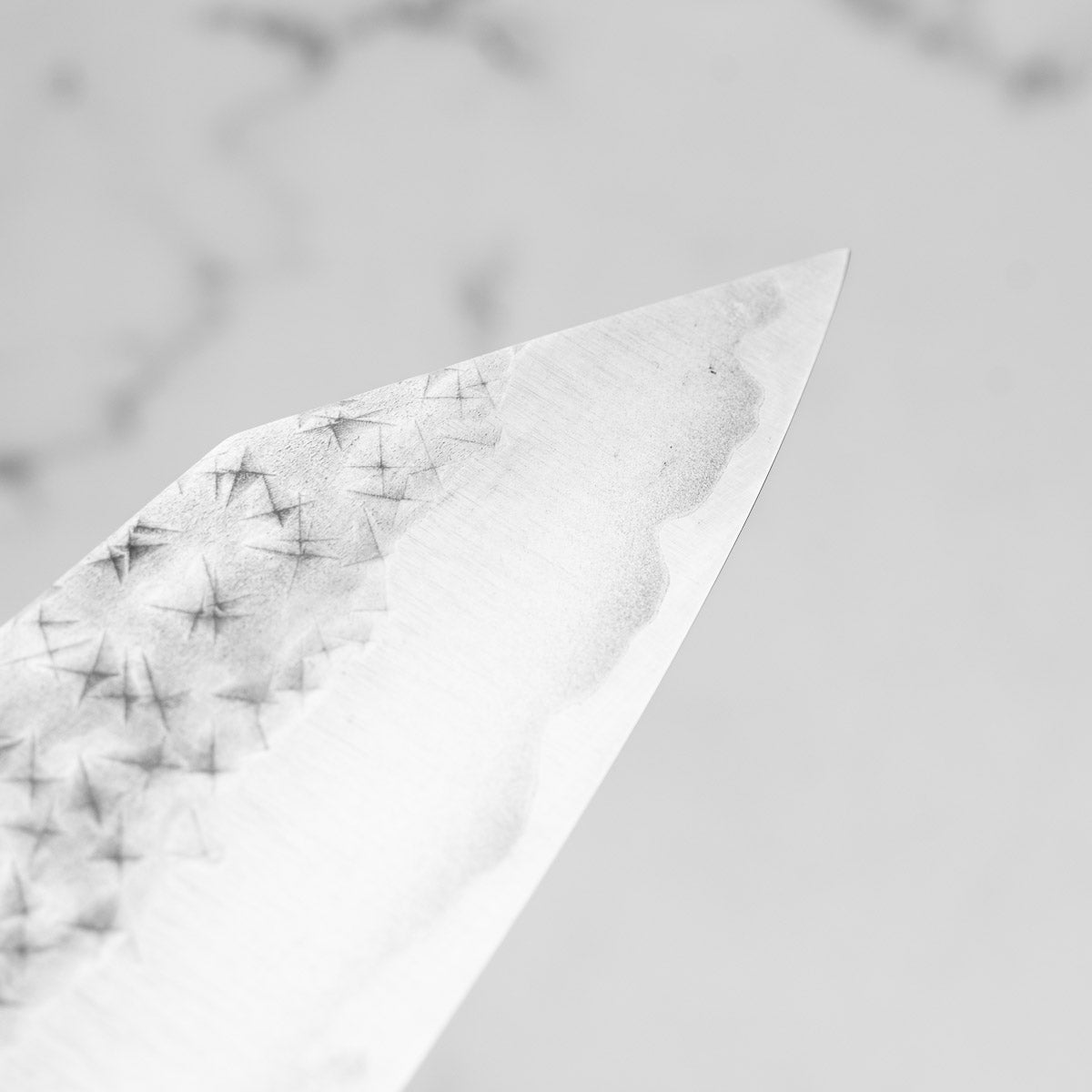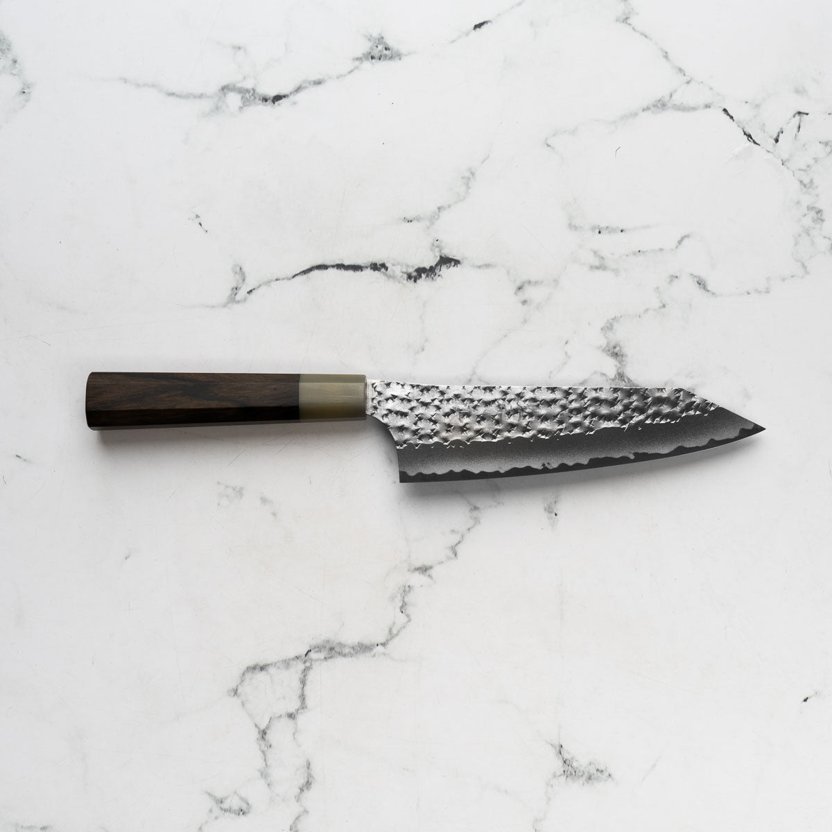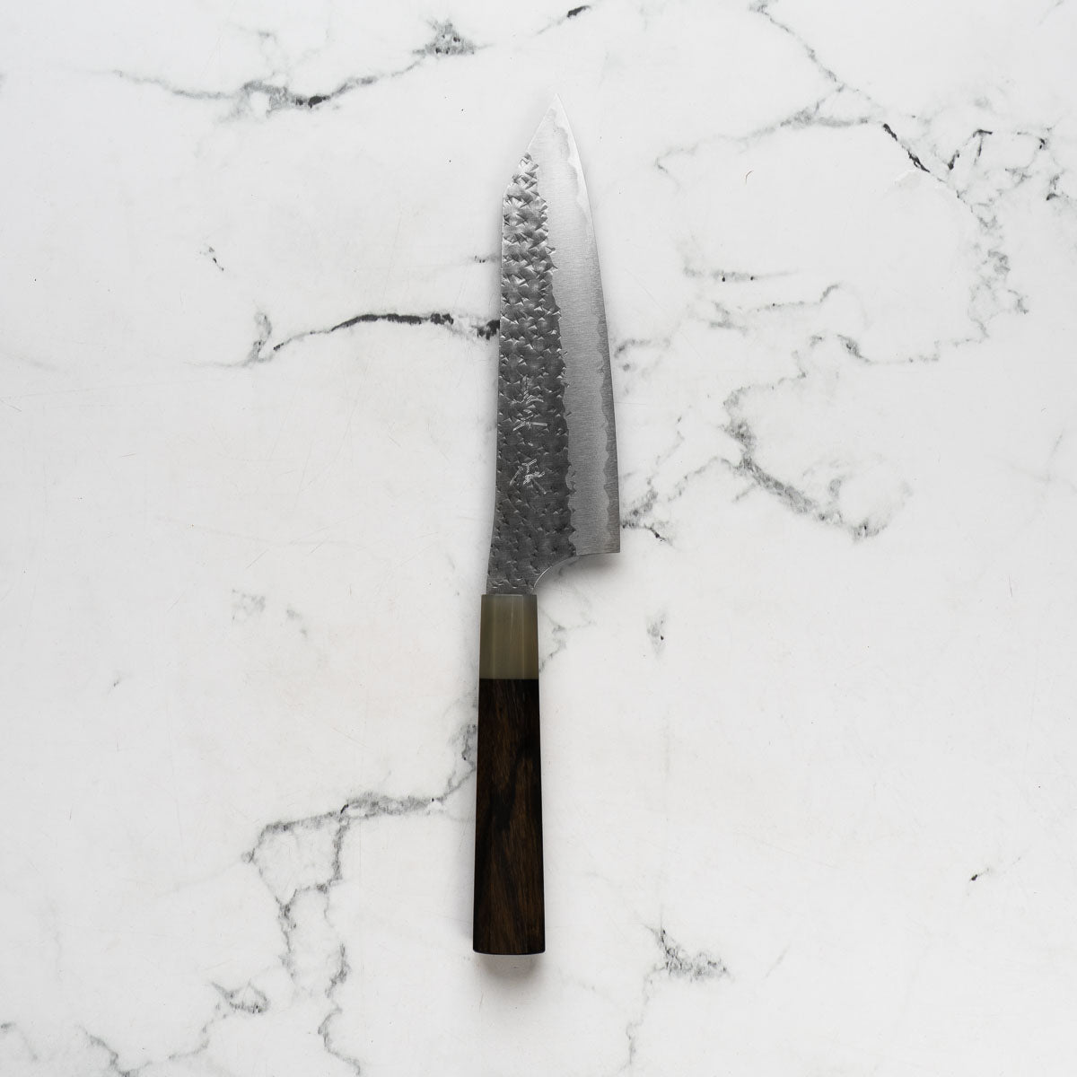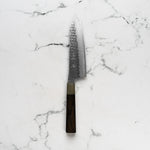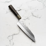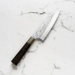 His knives are instantly recognizable for their striking Tsuchime and Suminagashi finishes, thin grinds, and use of high-performance steels such as SG2, HAP40, and stainless-clad Blue Super. Kurosaki’s Fujin series, with its dramatic wind-patterned hammer finish, helped cement his reputation as a blacksmith who blends artistry and technical brilliance in equal measure.