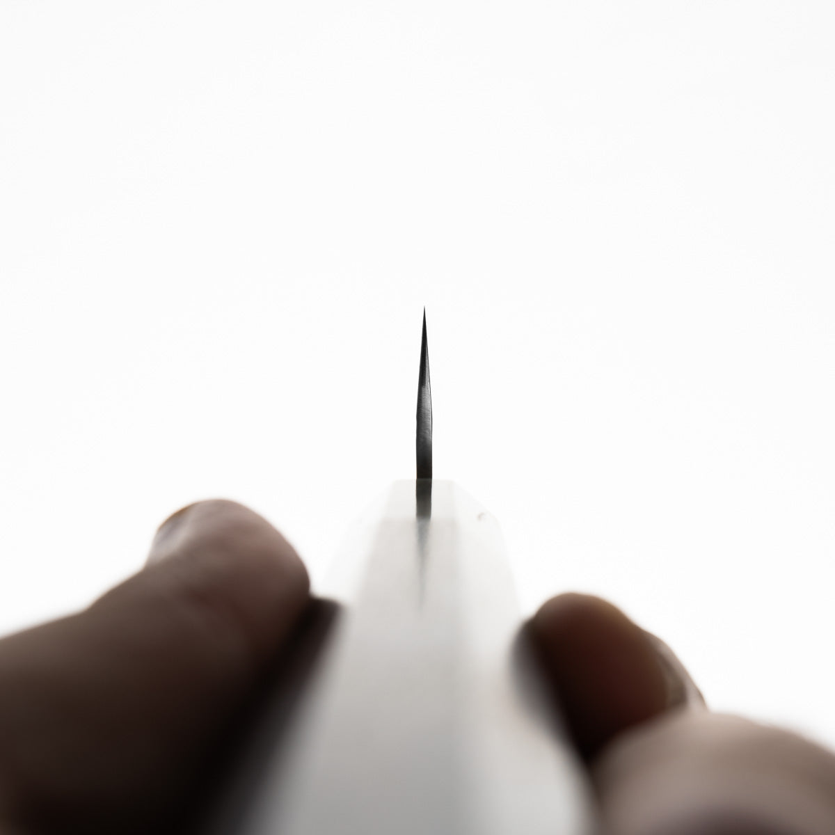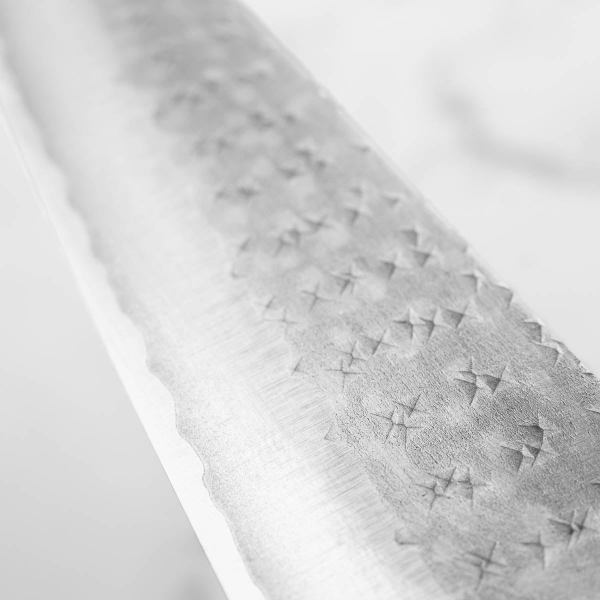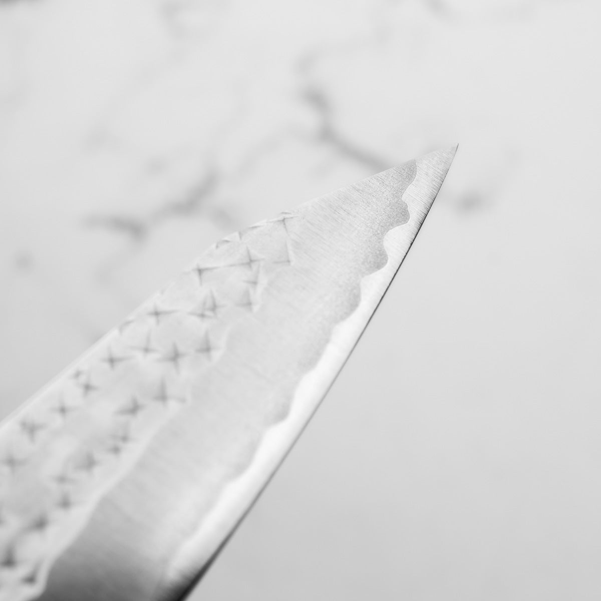 His knives are instantly recognizable for their striking Tsuchime and Suminagashi finishes, thin grinds, and use of high-performance steels such as SG2, HAP40, and stainless-clad Blue Super. Kurosaki’s Fujin series, with its dramatic wind-patterned hammer finish, helped cement his reputation as a blacksmith who blends artistry and technical brilliance in equal measure.
