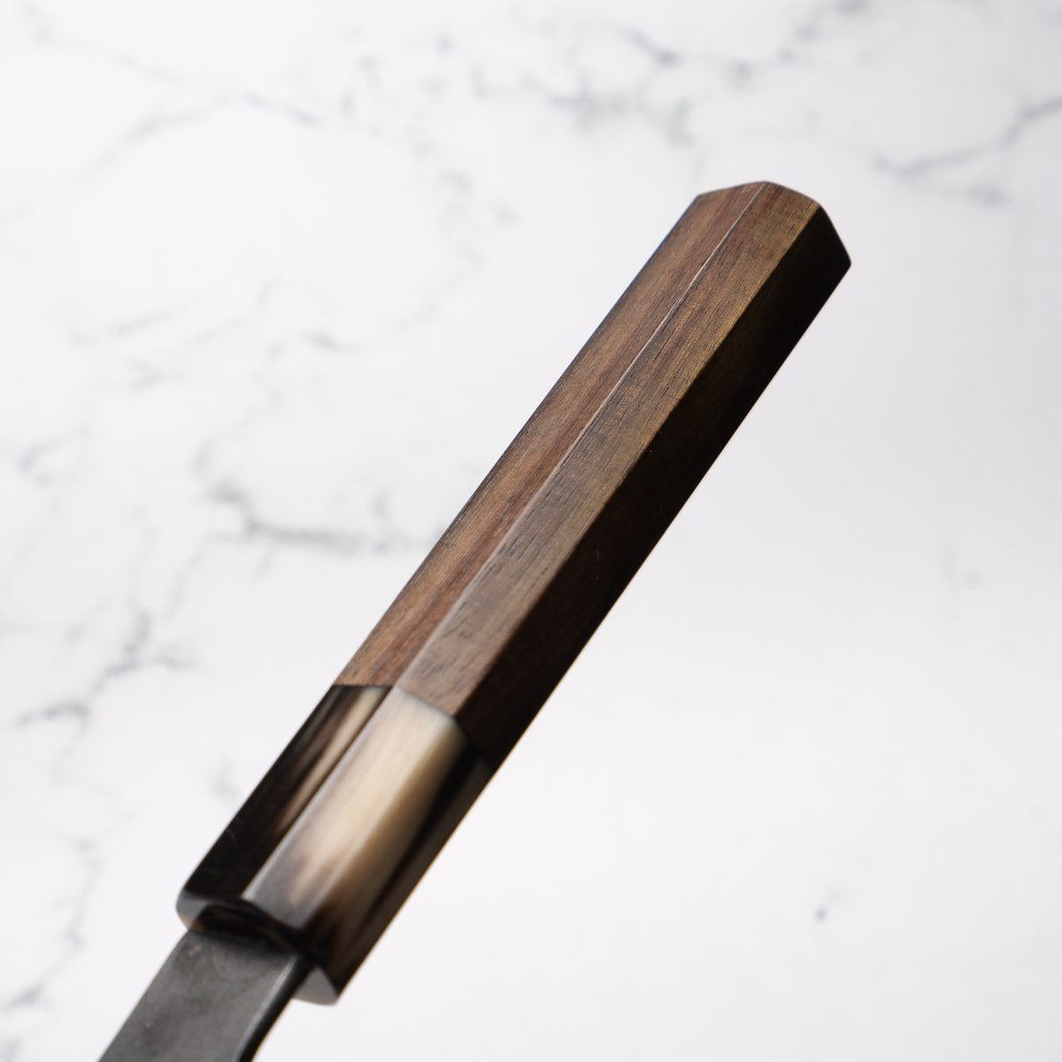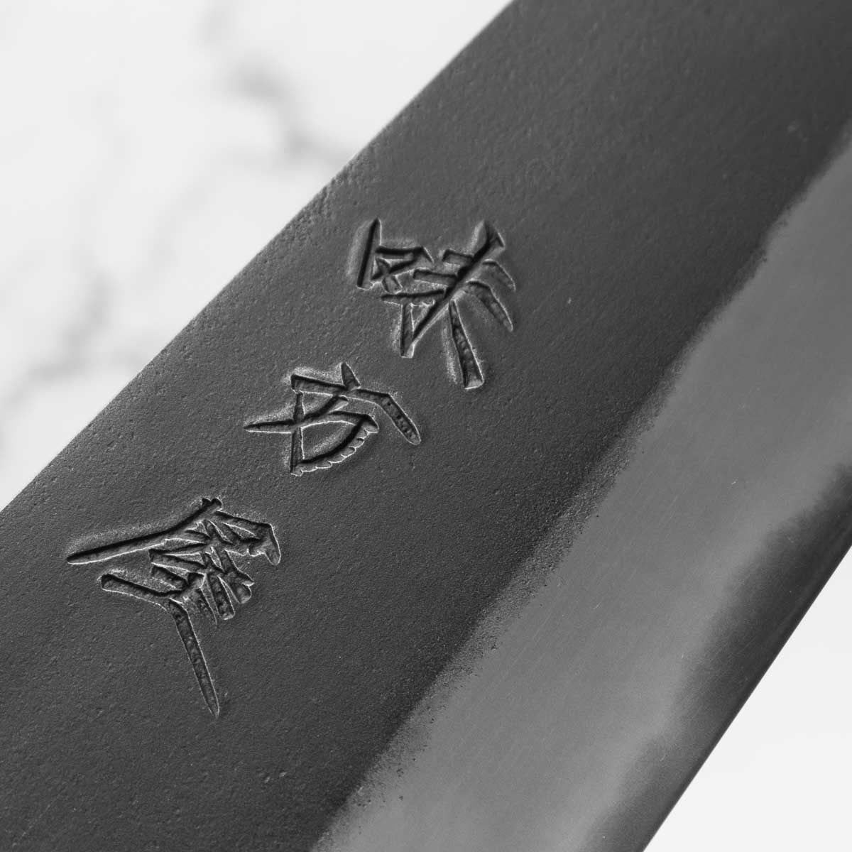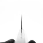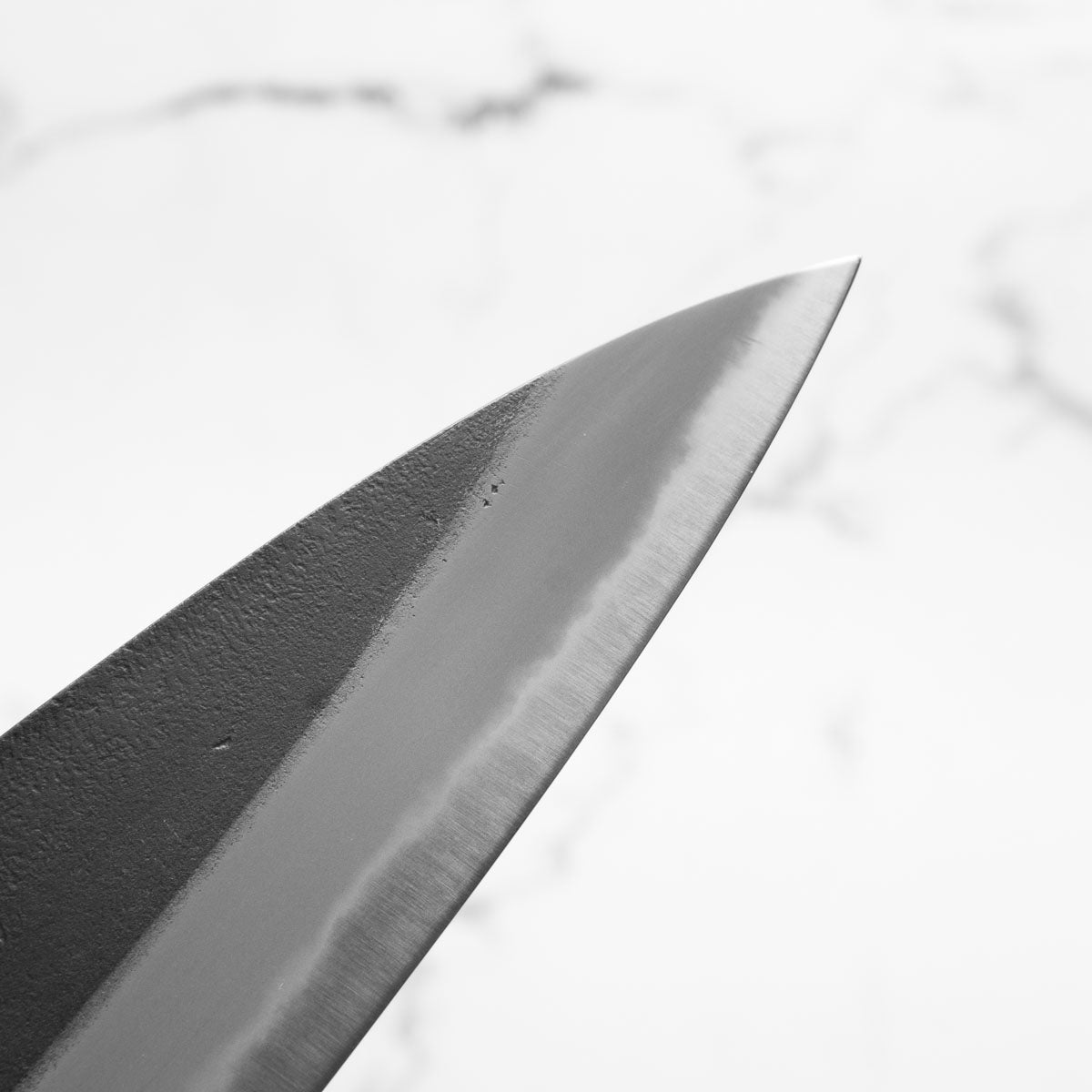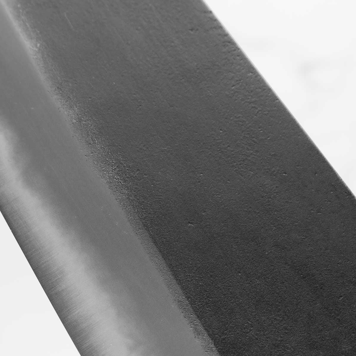 Japanese White Steel #2, a traditional high-carbon steel, is cherished for its purity and fine grain structure, enabling razor-sharp edges, at the cost of being reactive. It is one of the easiest steels to sharpen, but cannot be left wet for even short periods otherwise rust spots can occur. If you’re fastidious in your knife maintenance, this knife steel can be extremely rewarding to use.