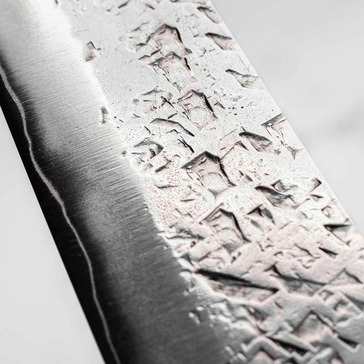 His knives are instantly recognizable for their striking Tsuchime and Suminagashi finishes, thin grinds, and use of high-performance steels such as SG2, HAP40, and stainless-clad Blue Super. Kurosaki’s Fujin series, with its dramatic wind-patterned hammer finish, helped cement his reputation as a blacksmith who blends artistry and technical brilliance in equal measure.