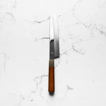 The Kiritsuke knife, a symbol of expertise in Japanese cuisine is similar to the Gyuto but has a flatter profile. This multi-purpose knife combines features of a slicer and a vegetable knife, with its angled tip and long blade. It excels in precise slicing, chopping, and julienning, making it a prestigious and versatile tool.