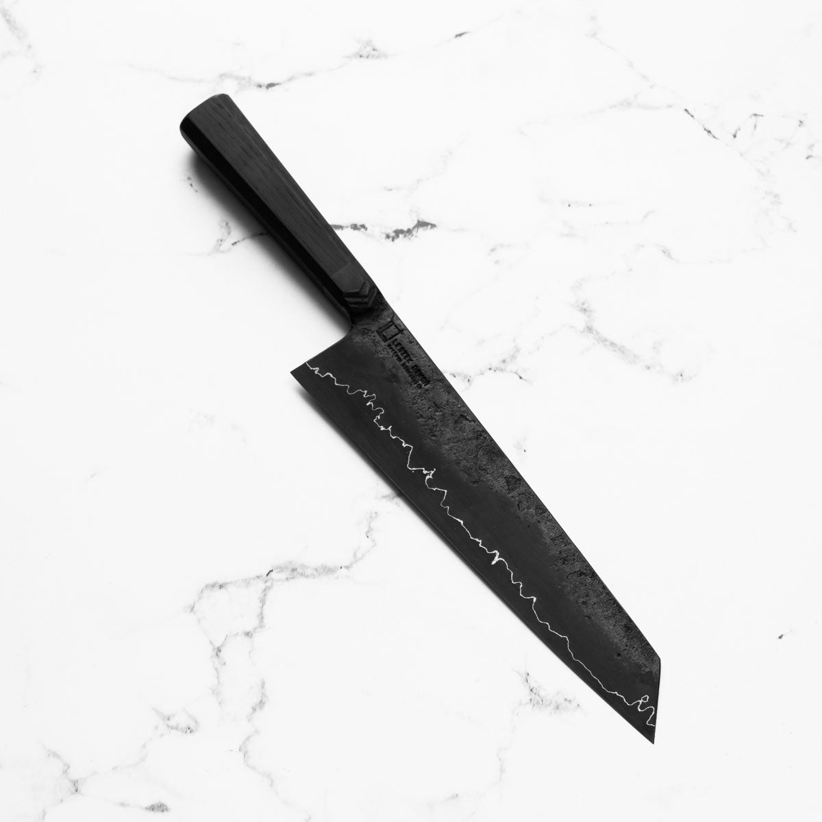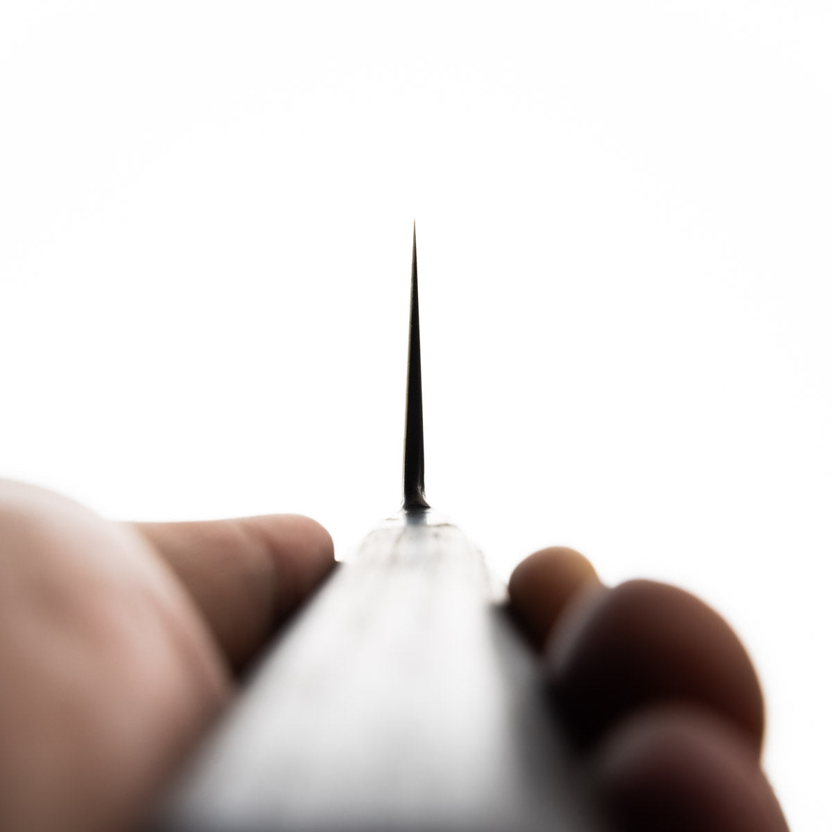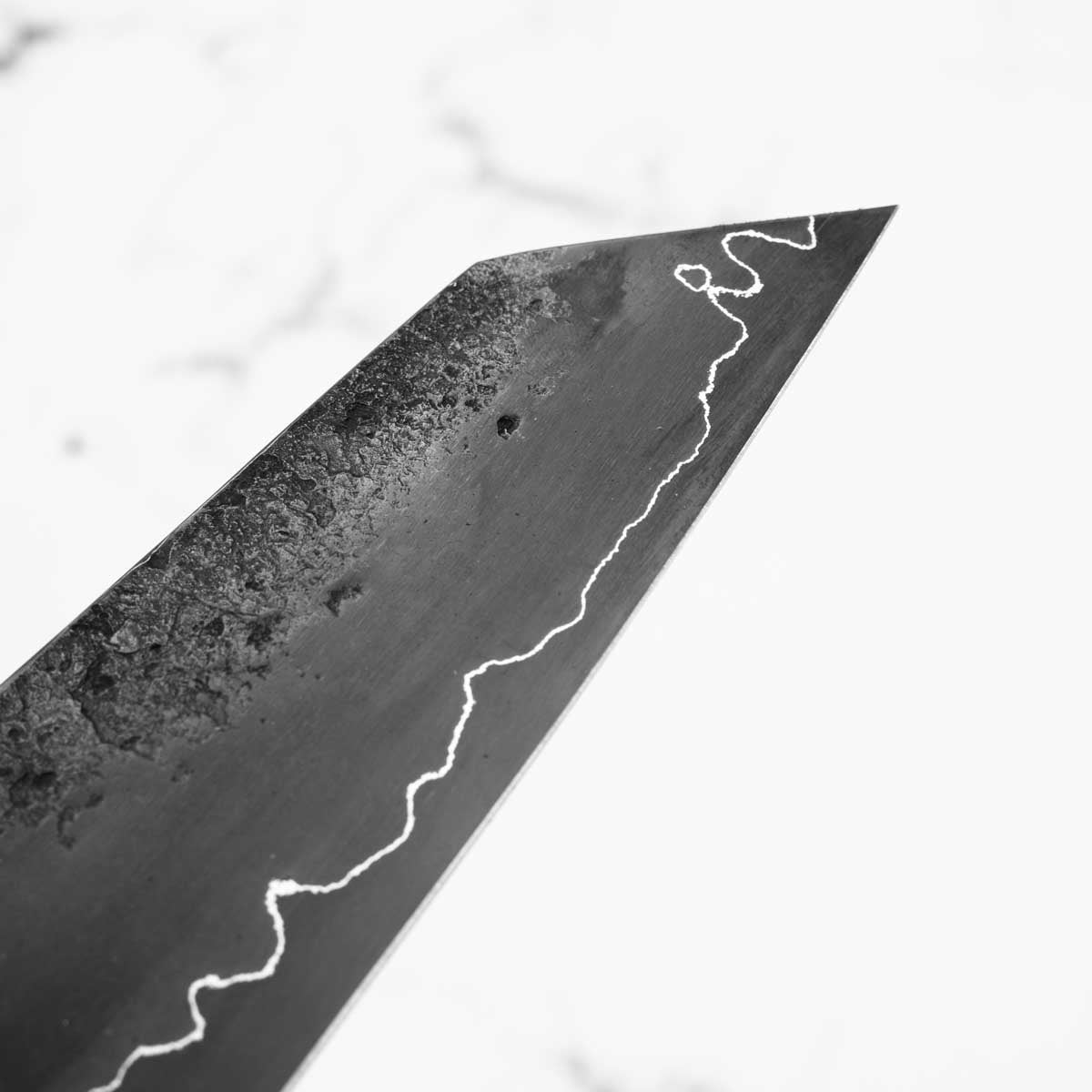 This knife is made from a high-carbon steel and as such, will require a little more care than a regular off-the-shelf knife. It must be dried shortly after use, as prolonged exposure to moisture can cause rust spots to appear. A very light coat of oil during storage also helps to prevent rust spots. A patina (colouration and seasoning of the steel) will occur with use.