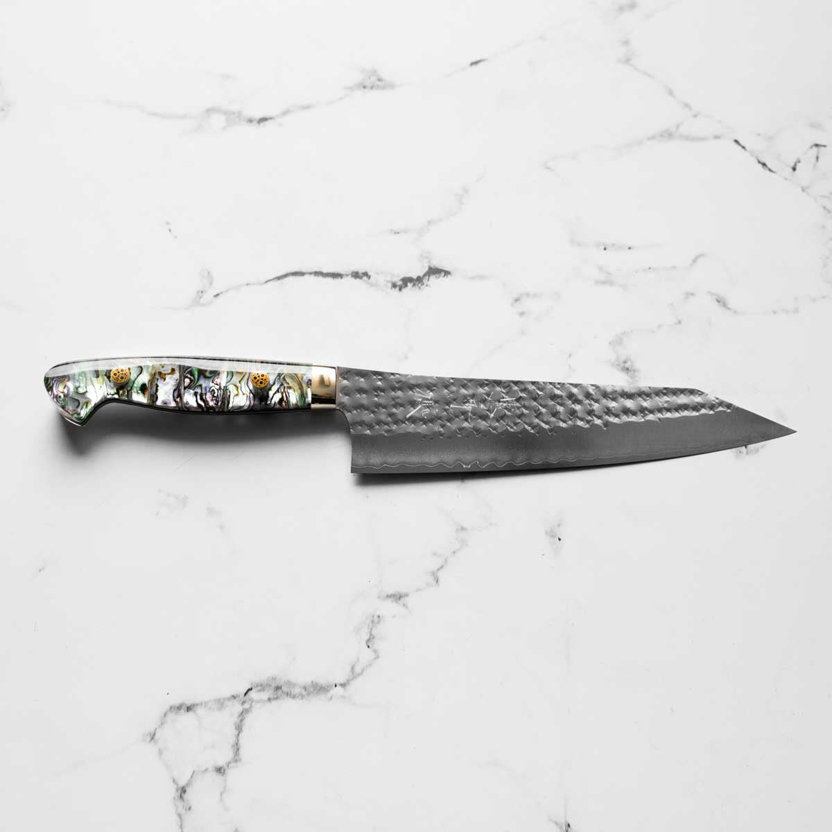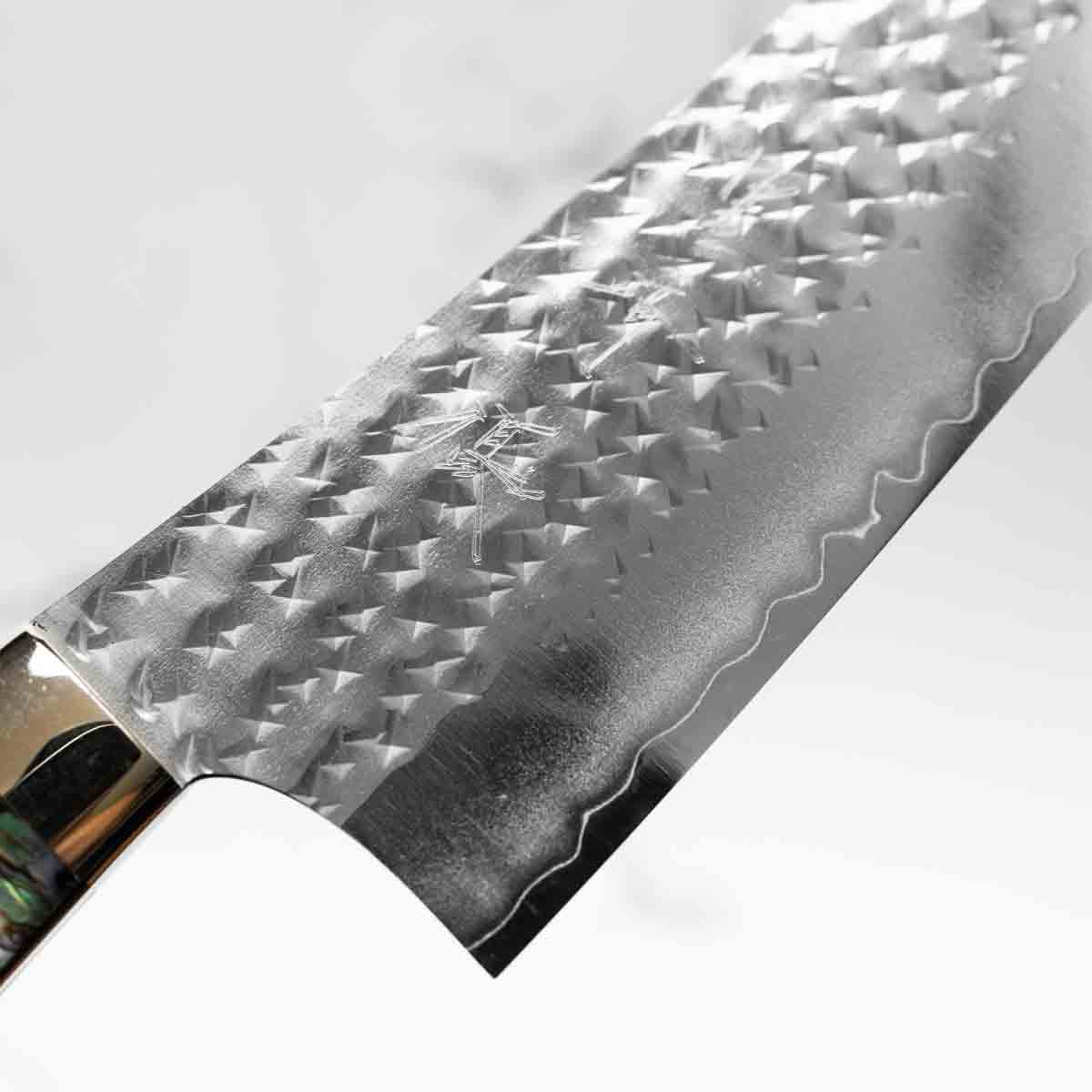 His knives are instantly recognizable for their striking Tsuchime and Suminagashi finishes, thin grinds, and use of high-performance steels such as SG2, HAP40, and stainless-clad Blue Super. Kurosaki’s Fujin series, with its dramatic wind-patterned hammer finish, helped cement his reputation as a blacksmith who blends artistry and technical brilliance in equal measure.