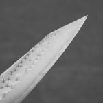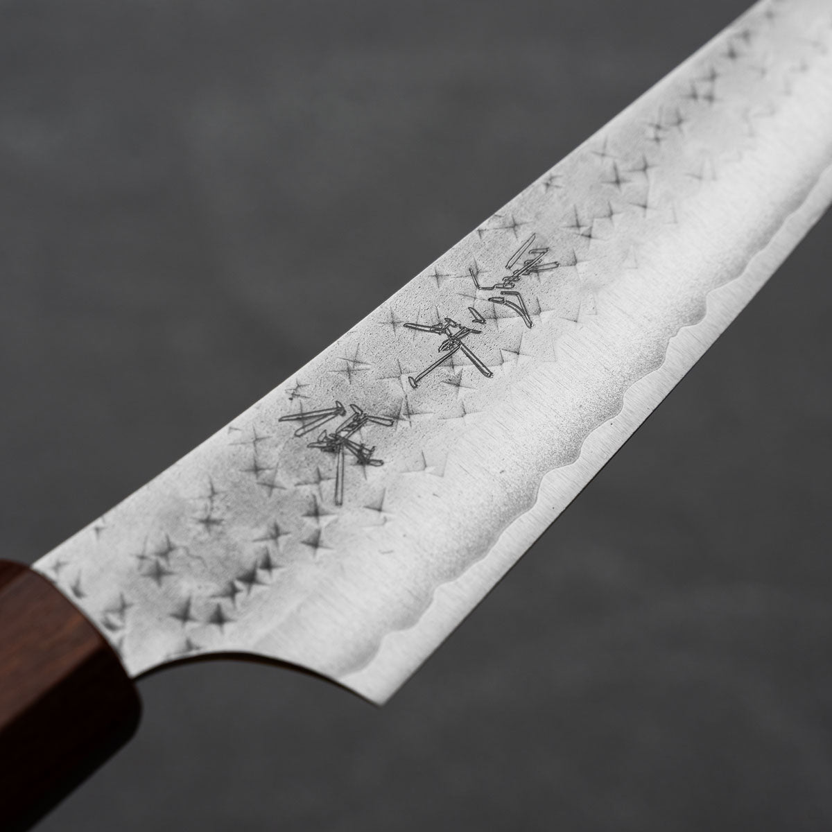 His knives are instantly recognizable for their striking Tsuchime and Suminagashi finishes, thin grinds, and use of high-performance steels such as SG2, HAP40, and stainless-clad Blue Super. Kurosaki’s Fujin series, with its dramatic wind-patterned hammer finish, helped cement his reputation as a blacksmith who blends artistry and technical brilliance in equal measure.