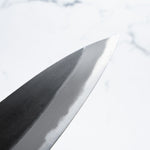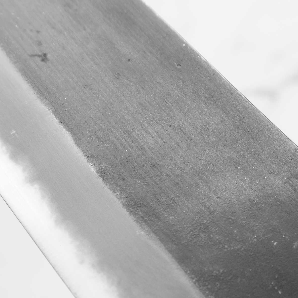 Japanese White Steel #2, a traditional high-carbon steel, is cherished for its purity and fine grain structure, enabling razor-sharp edges, at the cost of being reactive. It is one of the easiest steels to sharpen, but cannot be left wet for even short periods otherwise rust spots can occur. If you’re fastidious in your knife maintenance, this knife steel can be extremely rewarding to use.