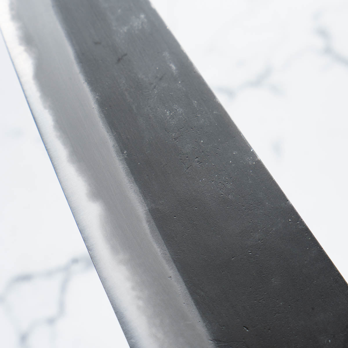 This knife is made from a high-carbon steel and as such, will require a little more care than a regular off-the-shelf knife. It must be dried shortly after use, as prolonged exposure to moisture can cause rust spots to appear. A very light coat of oil during storage also helps to prevent rust spots. A patina (colouration and seasoning of the steel) will occur with use.
