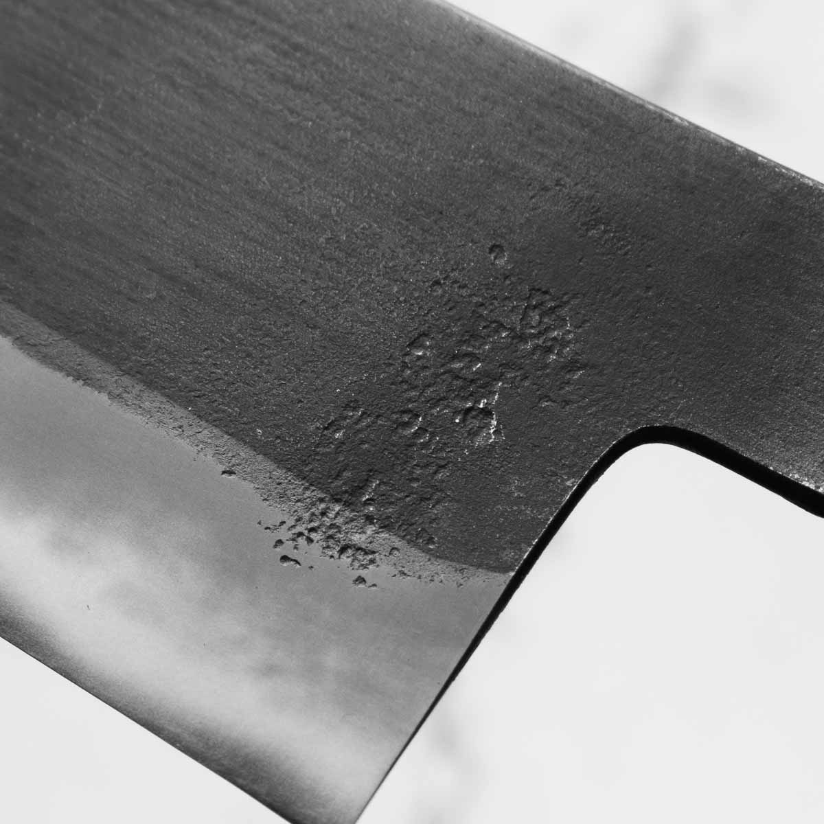 Japanese White Steel #2, a traditional high-carbon steel, is cherished for its purity and fine grain structure, enabling razor-sharp edges, at the cost of being reactive. It is one of the easiest steels to sharpen, but cannot be left wet for even short periods otherwise rust spots can occur. If you’re fastidious in your knife maintenance, this knife steel can be extremely rewarding to use.