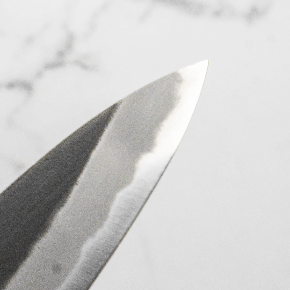 Japanese White Steel #2, a traditional high-carbon steel, is cherished for its purity and fine grain structure, enabling razor-sharp edges, at the cost of being reactive. It is one of the easiest steels to sharpen, but cannot be left wet for even short periods otherwise rust spots can occur. If you’re fastidious in your knife maintenance, this knife steel can be extremely rewarding to use.