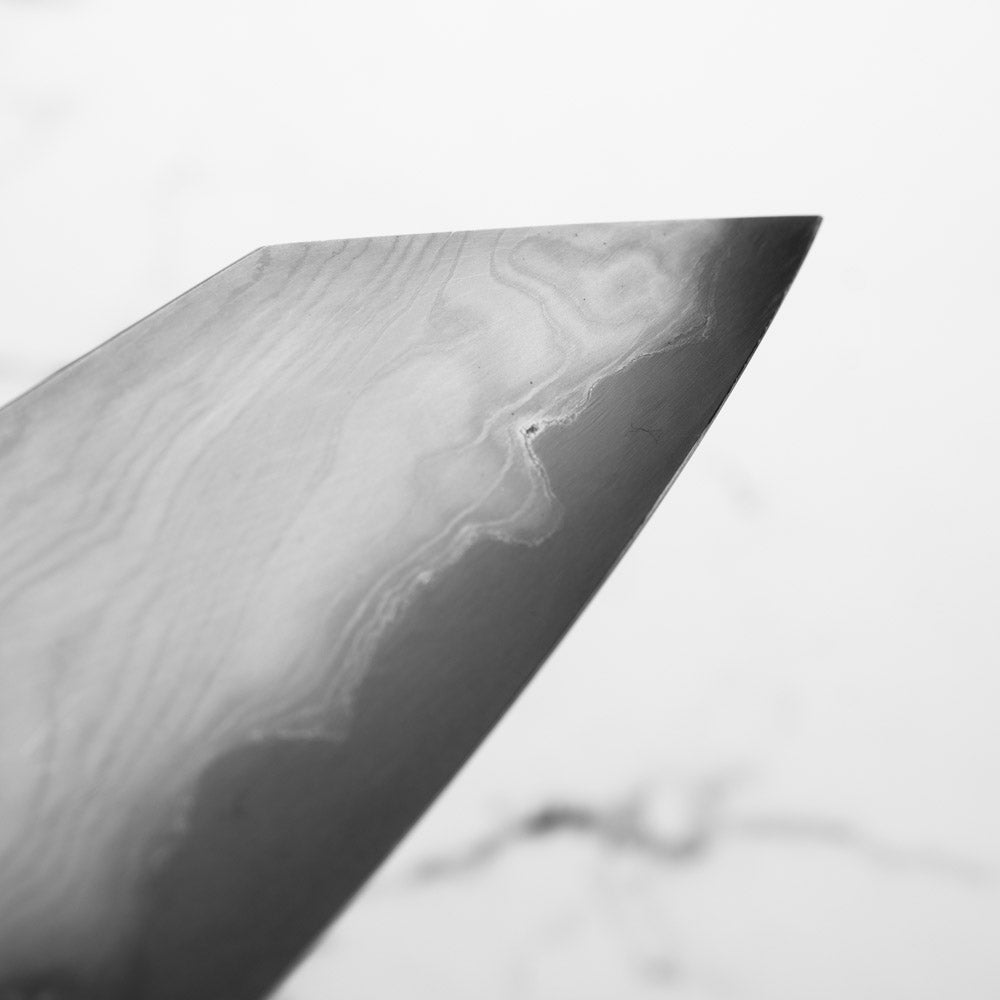 This knife is made from a high-carbon steel and as such, will require a little more care than a regular off-the-shelf knife. It must be dried shortly after use, as prolonged exposure to moisture can cause rust spots to appear. A very light coat of oil during storage also helps to prevent rust spots. A patina (colouration and seasoning of the steel) will occur with use.
