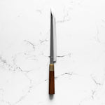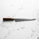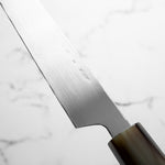 The Takohiki knife is a specialized Japanese knife, traditionally crafted for slicing octopus and other seafood. It is a regional variation of the sashimi knife, originating from the Kansai area of Japan. The Takohiki features a long, rectangular blade with a straightedge and a blunt tip, designed for achieving clean, precise cuts of fish or delicate ingredients. Its shape allows chefs to make long, uninterrupted pulls through the food, reducing friction and maintaining the integrity of each slice. This knife is ideal for preparing sashimi with exceptional control and precision, embodying Japanese culinary artistry.