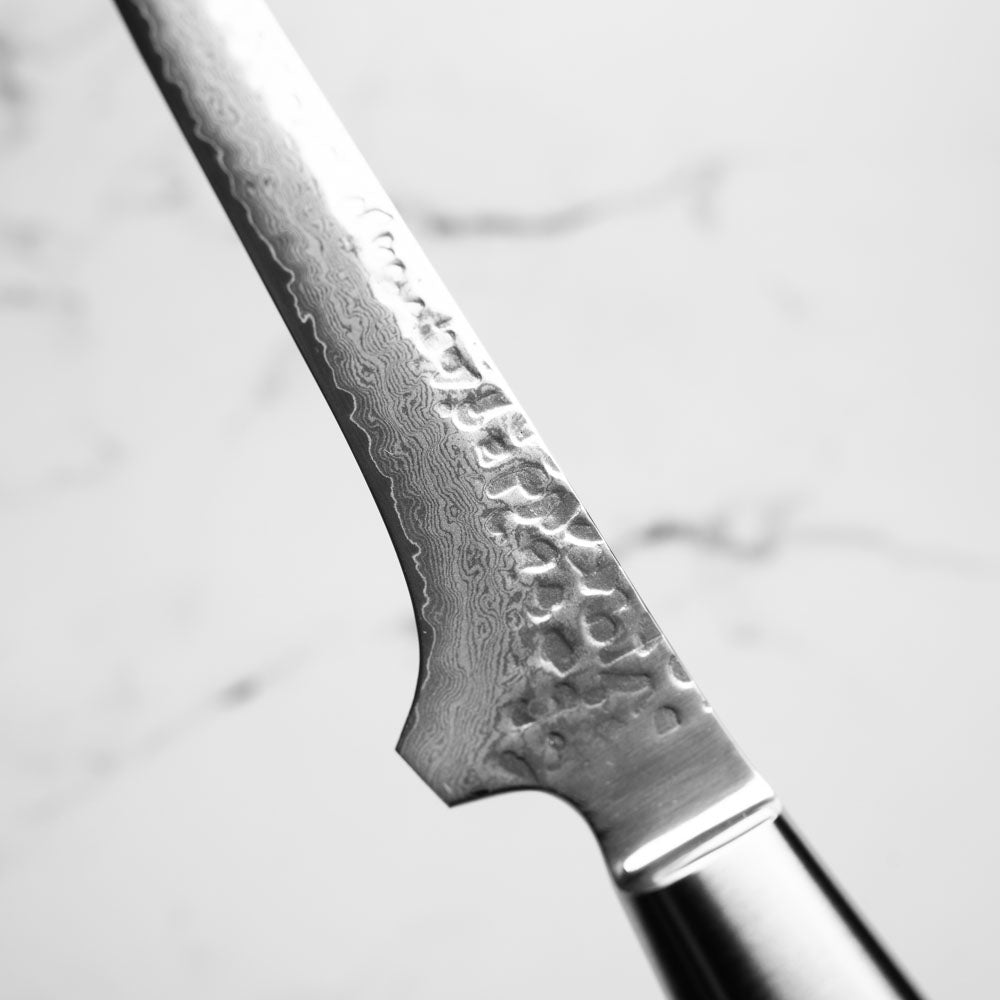 The boning knife, a specialized kitchen tool, is designed for separating meat from bones and trimming fat. With its shorter, flexible blade, typically ranging from 130mm to 160mm, it excels in maneuvering around joints and contours, allowing for precision in intricate cutting tasks. Its design ensures optimal control and accuracy, making it perfect for butchering and filleting various proteins, including poultry and fish.