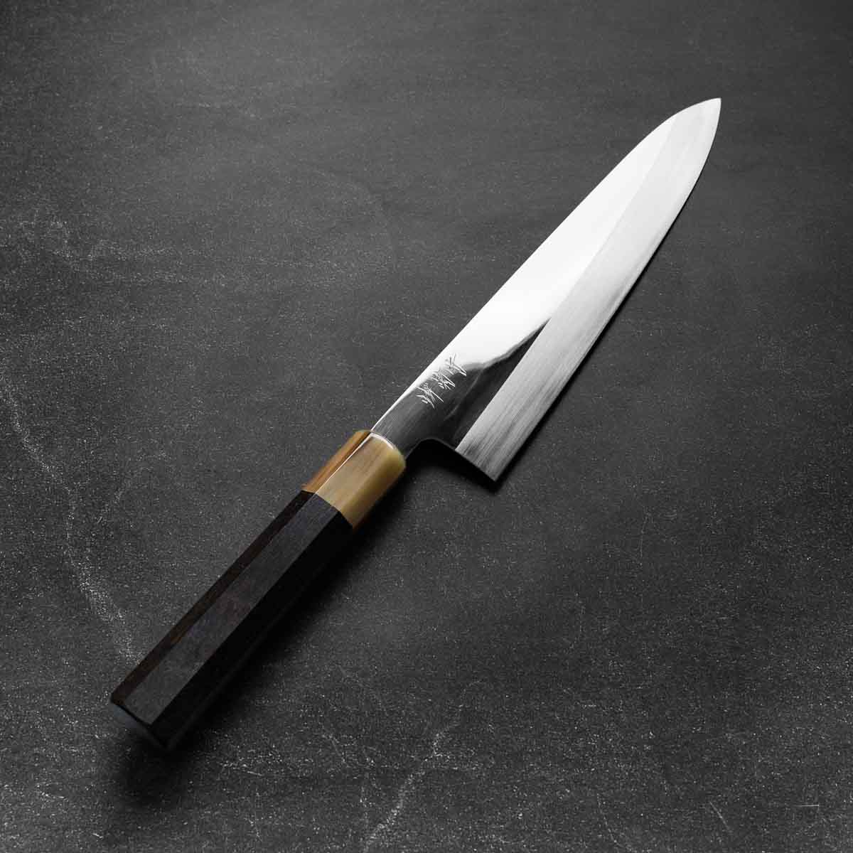 Japanese White Steel #2, a traditional high-carbon steel, is cherished for its purity and fine grain structure, enabling razor-sharp edges, at the cost of being reactive. It is one of the easiest steels to sharpen, but cannot be left wet for even short periods otherwise rust spots can occur. If you’re fastidious in your knife maintenance, this knife steel can be extremely rewarding to use.