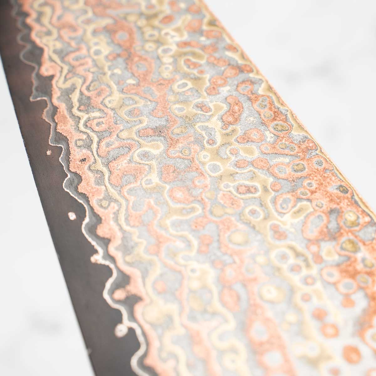 This knife is made from a high-carbon steel and as such, will require a little more care than a regular off-the-shelf knife. It must be dried shortly after use, as prolonged exposure to moisture can cause rust spots to appear. A very light coat of oil during storage also helps to prevent rust spots. A patina (colouration and seasoning of the steel) will occur with use.