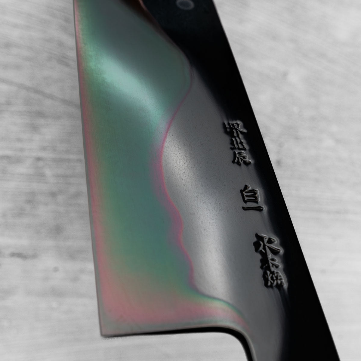 This knife is made from a high-carbon steel and as such, will require a little more care than a regular off-the-shelf knife. It must be dried shortly after use, as prolonged exposure to moisture can cause rust spots to appear. A very light coat of oil during storage also helps to prevent rust spots. A patina (colouration and seasoning of the steel) will occur with use.