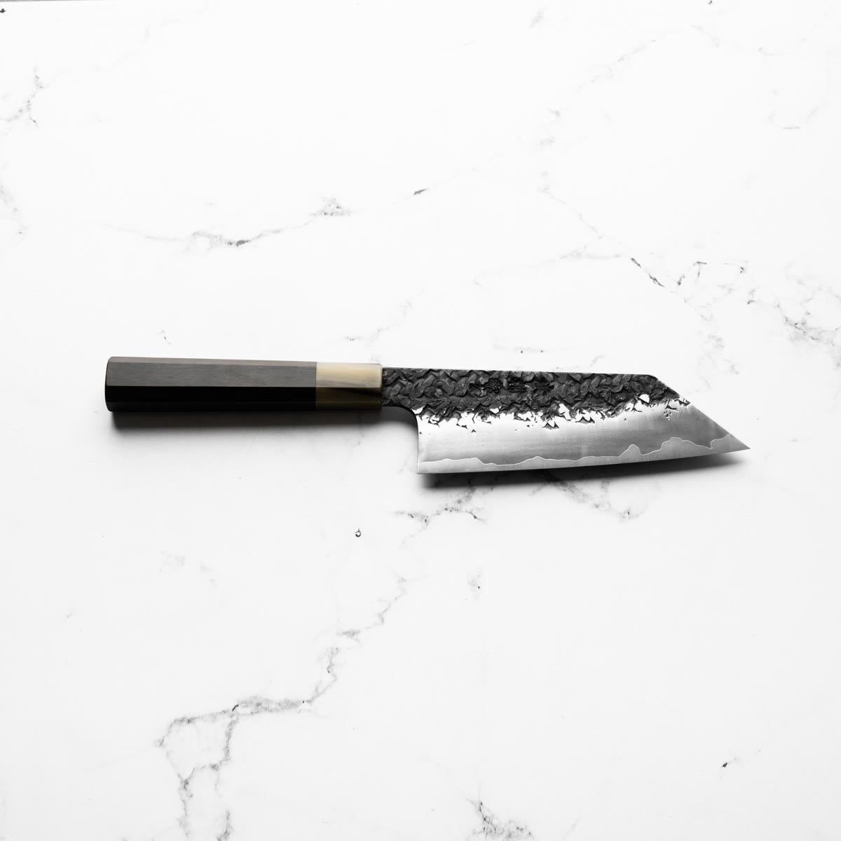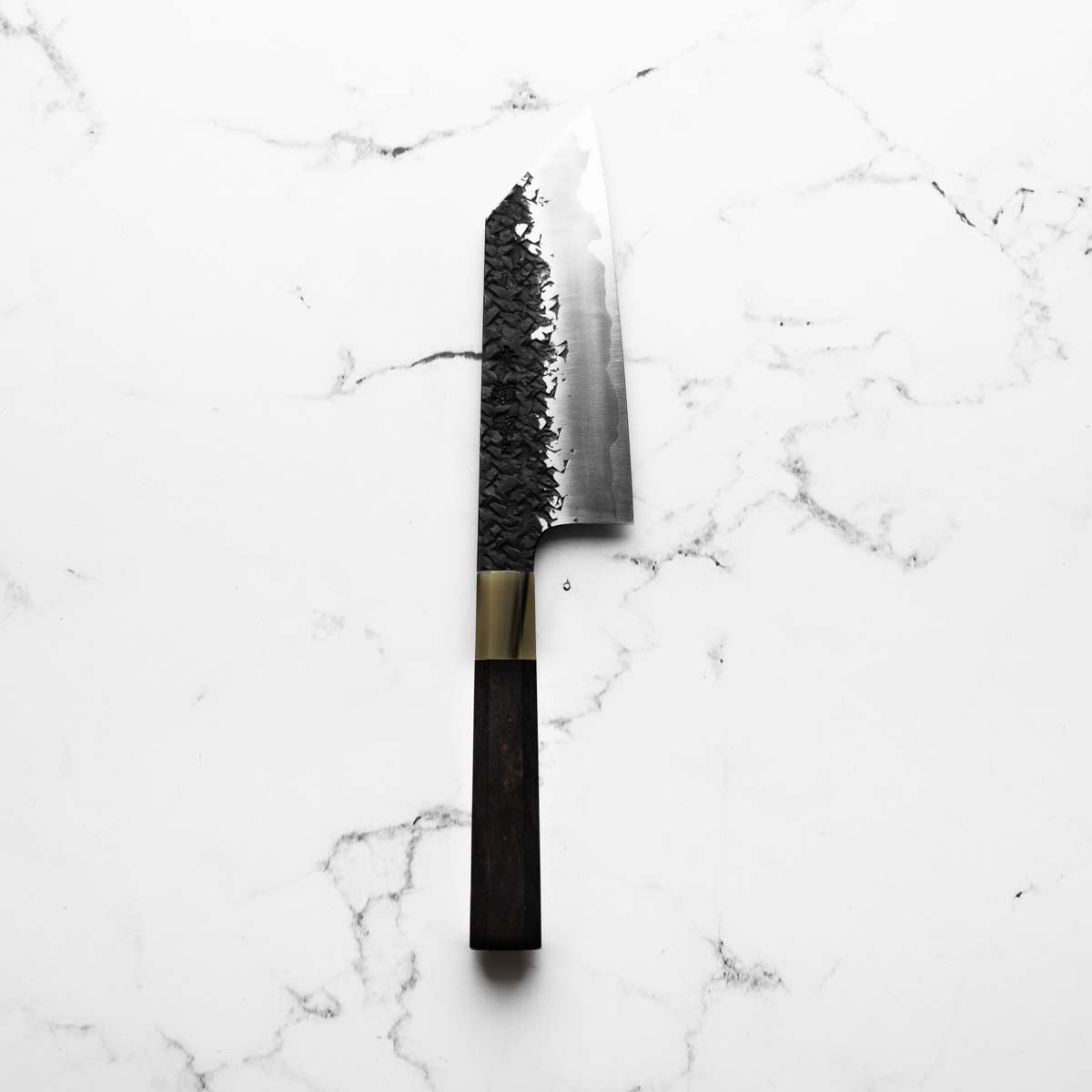 Embracing a rapid rise in popularity for his unique designs and committment to striving for perfection, Shunsuke Manaka is the man behind Kisuke knives. From the sketchbook to the kitchen, he is the sole craftsman behind the entire knifemaking process. Shunsuke engineers these knives using a process known as Warikomi, whereby a glowing hot piece of steel is split, and the core steel is wedged in and forged together. The split steel becomes the outer layers, and the core steel is exposed at the edge. This process produces a stronger, tougher more durable blade.