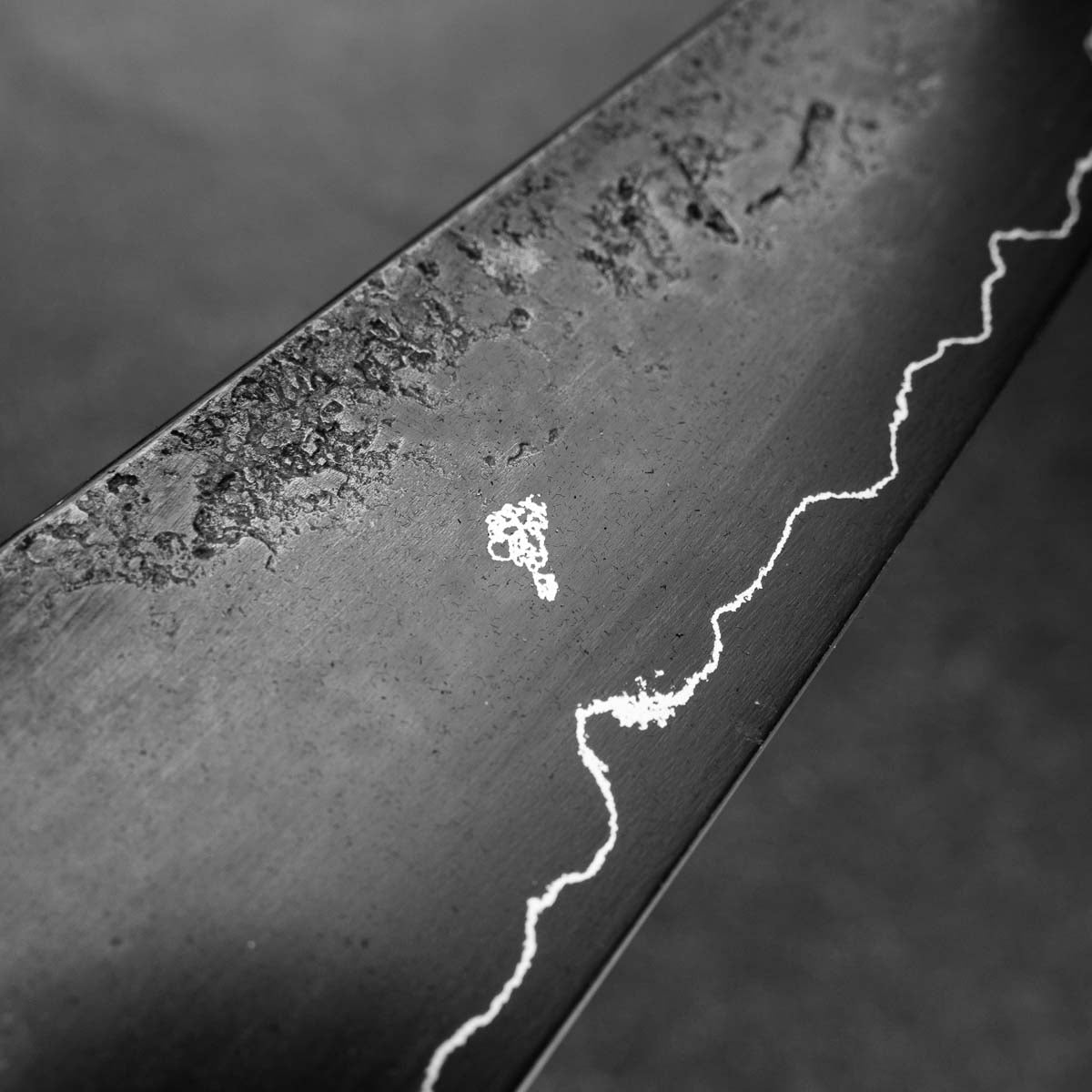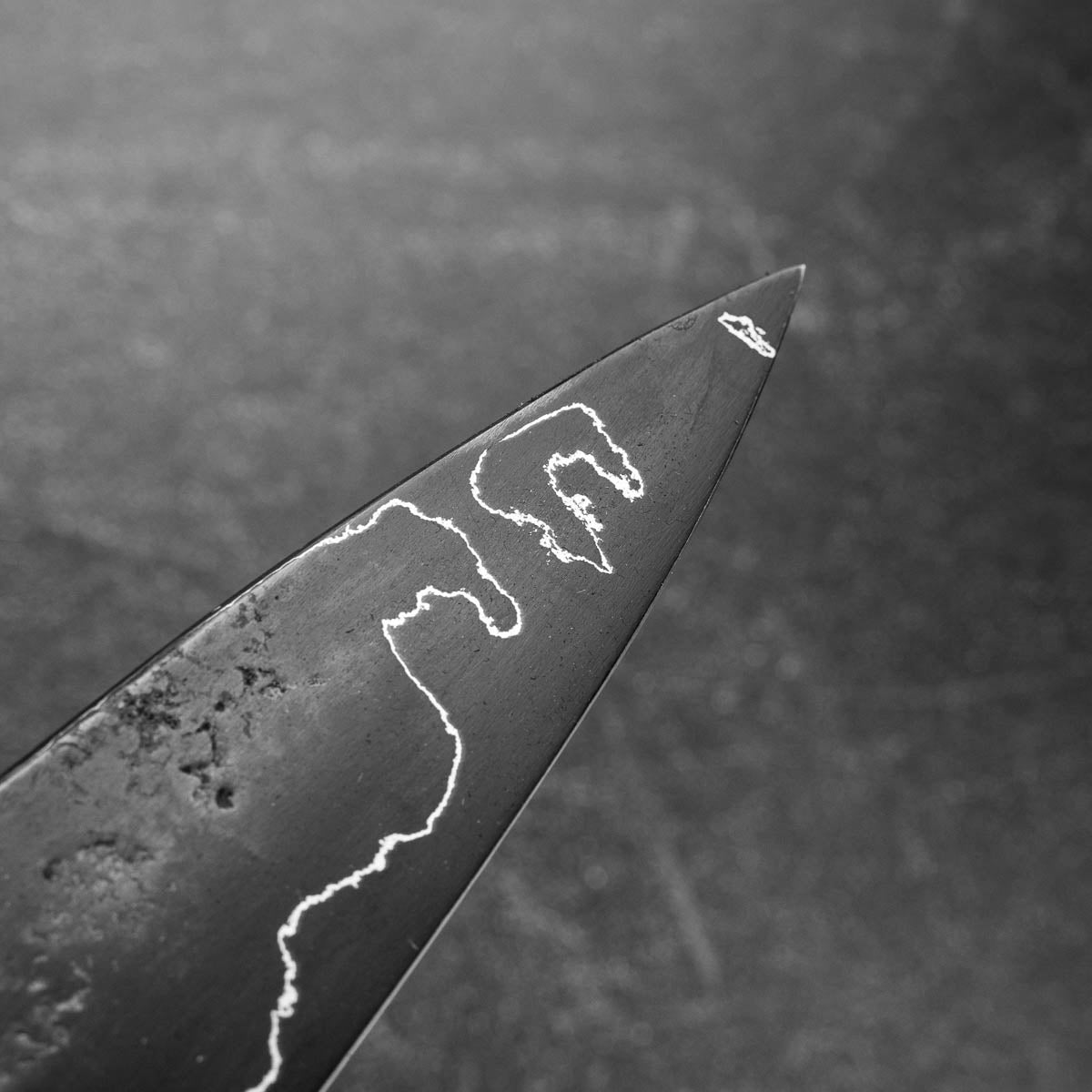 This knife is made from a high-carbon steel and as such, will require a little more care than a regular off-the-shelf knife. It must be dried shortly after use, as prolonged exposure to moisture can cause rust spots to appear. A very light coat of oil during storage also helps to prevent rust spots. A patina (colouration and seasoning of the steel) will occur with use.