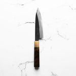 The Petty knife, a quintessential tool in Japanese cuisine, is a smaller utility knife used for precise, delicate tasks. Often considered a smaller sibling to the chef's knife, it excels in hand-held tasks like peeling, trimming, and intricate cutting. Its versatility makes it an essential for detailed culinary work.
