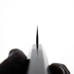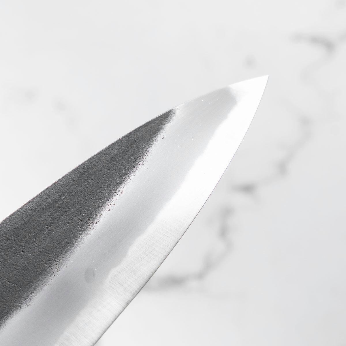 Japanese White Steel #2, a traditional high-carbon steel, is cherished for its purity and fine grain structure, enabling razor-sharp edges, at the cost of being reactive. It is one of the easiest steels to sharpen, but cannot be left wet for even short periods otherwise rust spots can occur. If you’re fastidious in your knife maintenance, this knife steel can be extremely rewarding to use.