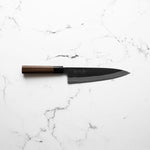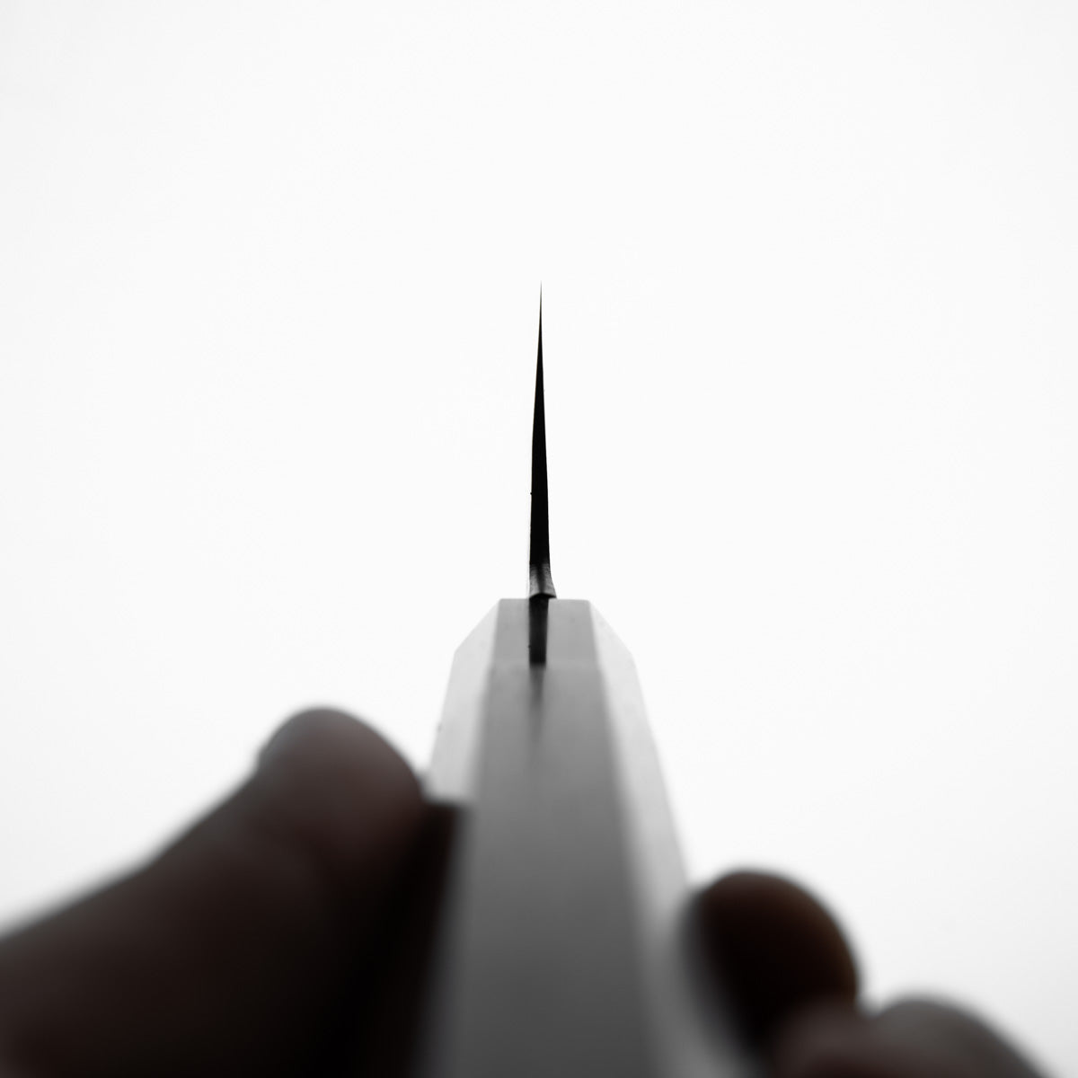 Japanese White Steel #2, a traditional high-carbon steel, is cherished for its purity and fine grain structure, enabling razor-sharp edges, at the cost of being reactive. It is one of the easiest steels to sharpen, but cannot be left wet for even short periods otherwise rust spots can occur. If you’re fastidious in your knife maintenance, this knife steel can be extremely rewarding to use.