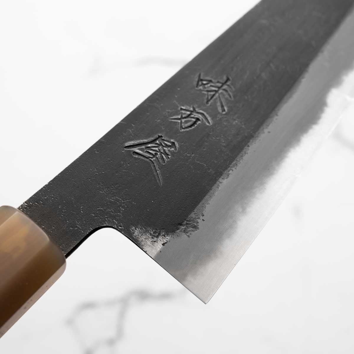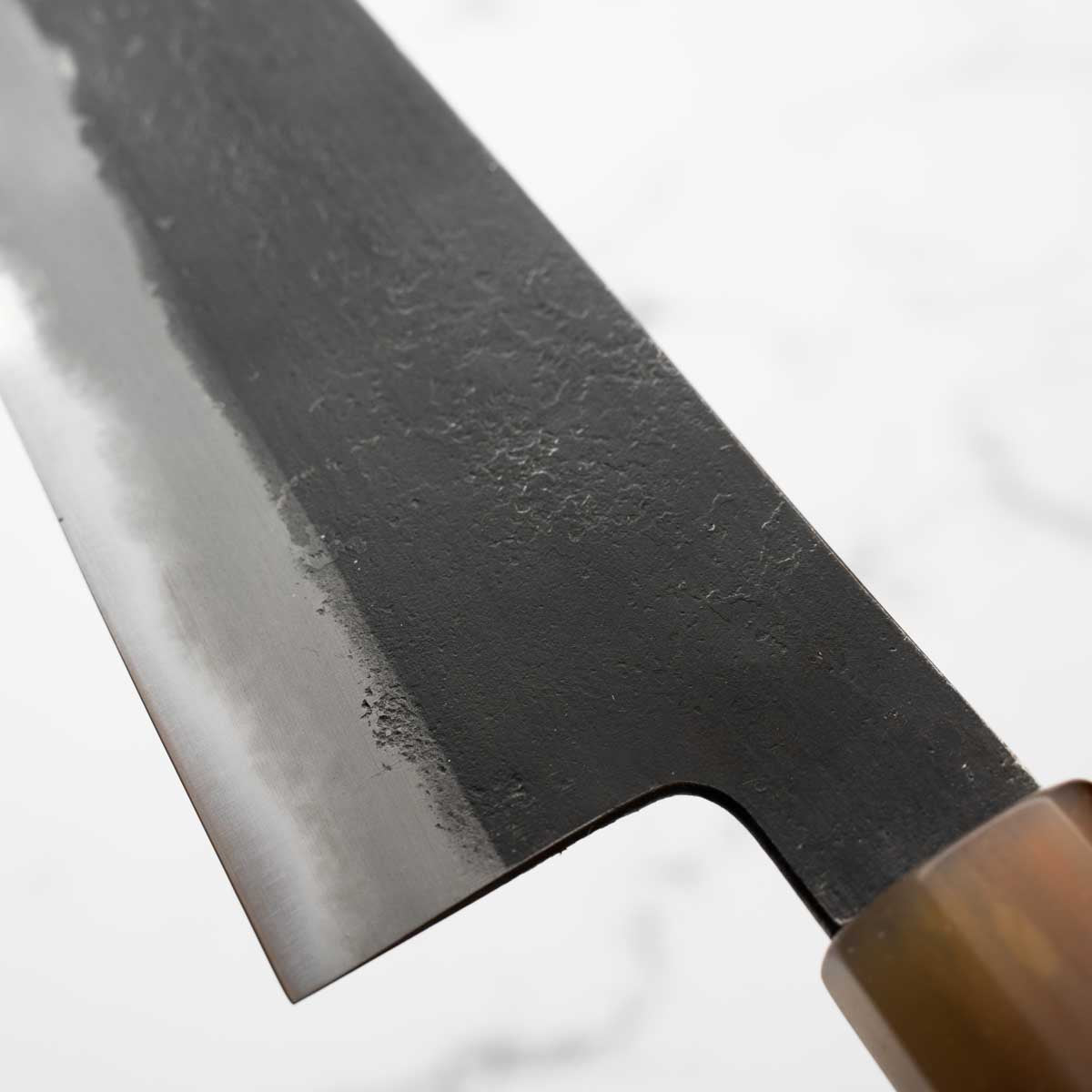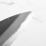 Japanese White Steel #2, a traditional high-carbon steel, is cherished for its purity and fine grain structure, enabling razor-sharp edges, at the cost of being reactive. It is one of the easiest steels to sharpen, but cannot be left wet for even short periods otherwise rust spots can occur. If you’re fastidious in your knife maintenance, this knife steel can be extremely rewarding to use.