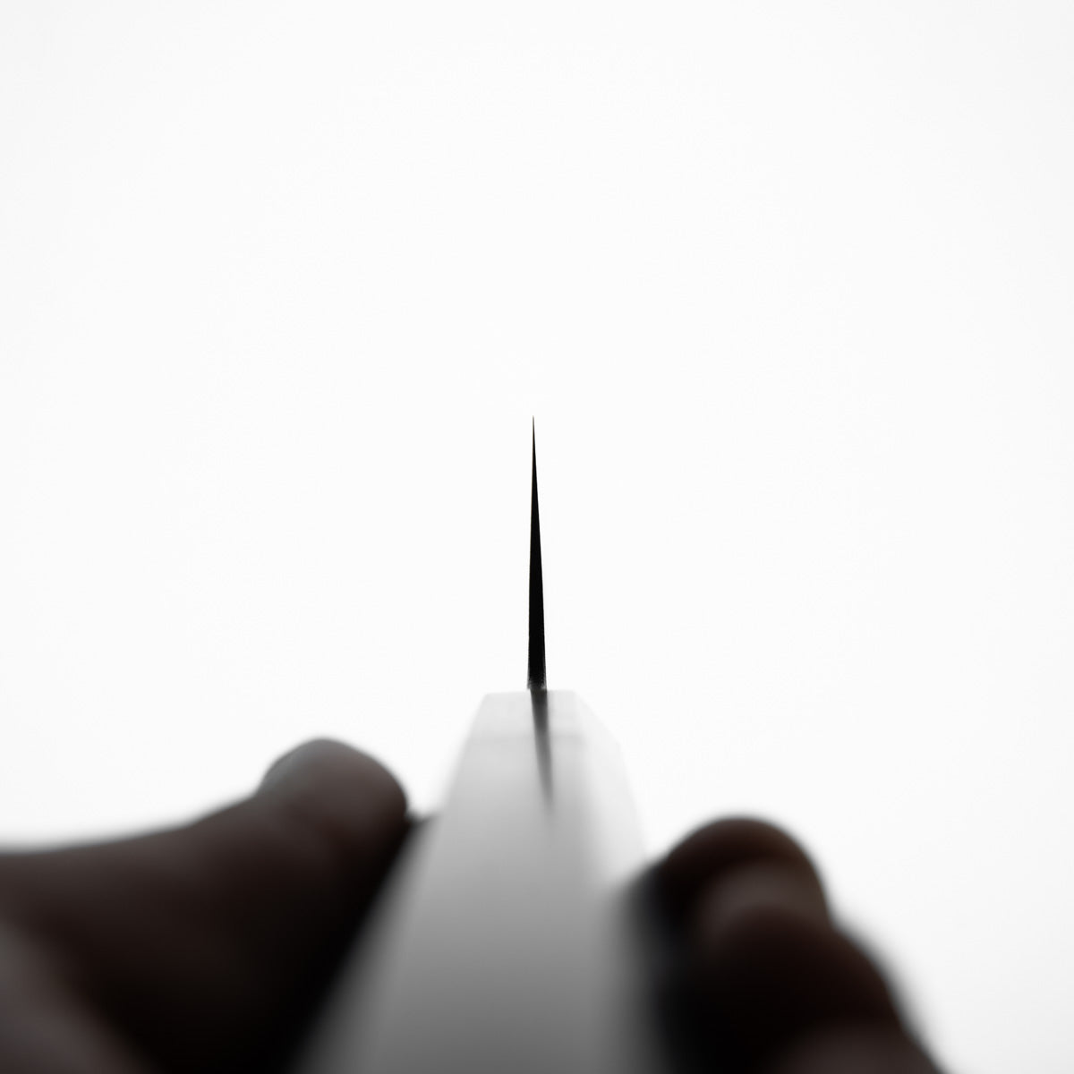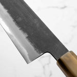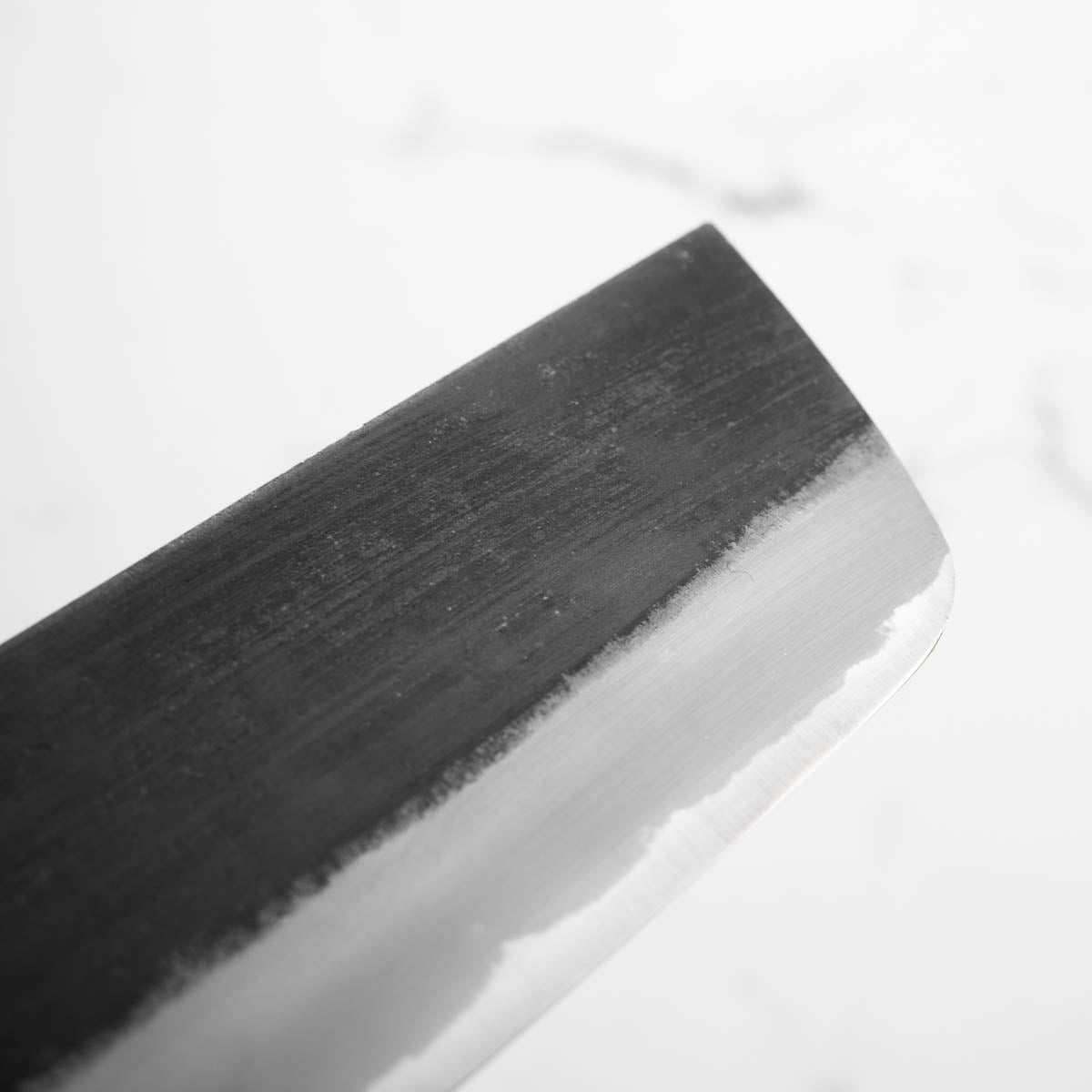 Japanese White Steel #2, a traditional high-carbon steel, is cherished for its purity and fine grain structure, enabling razor-sharp edges, at the cost of being reactive. It is one of the easiest steels to sharpen, but cannot be left wet for even short periods otherwise rust spots can occur. If you’re fastidious in your knife maintenance, this knife steel can be extremely rewarding to use.