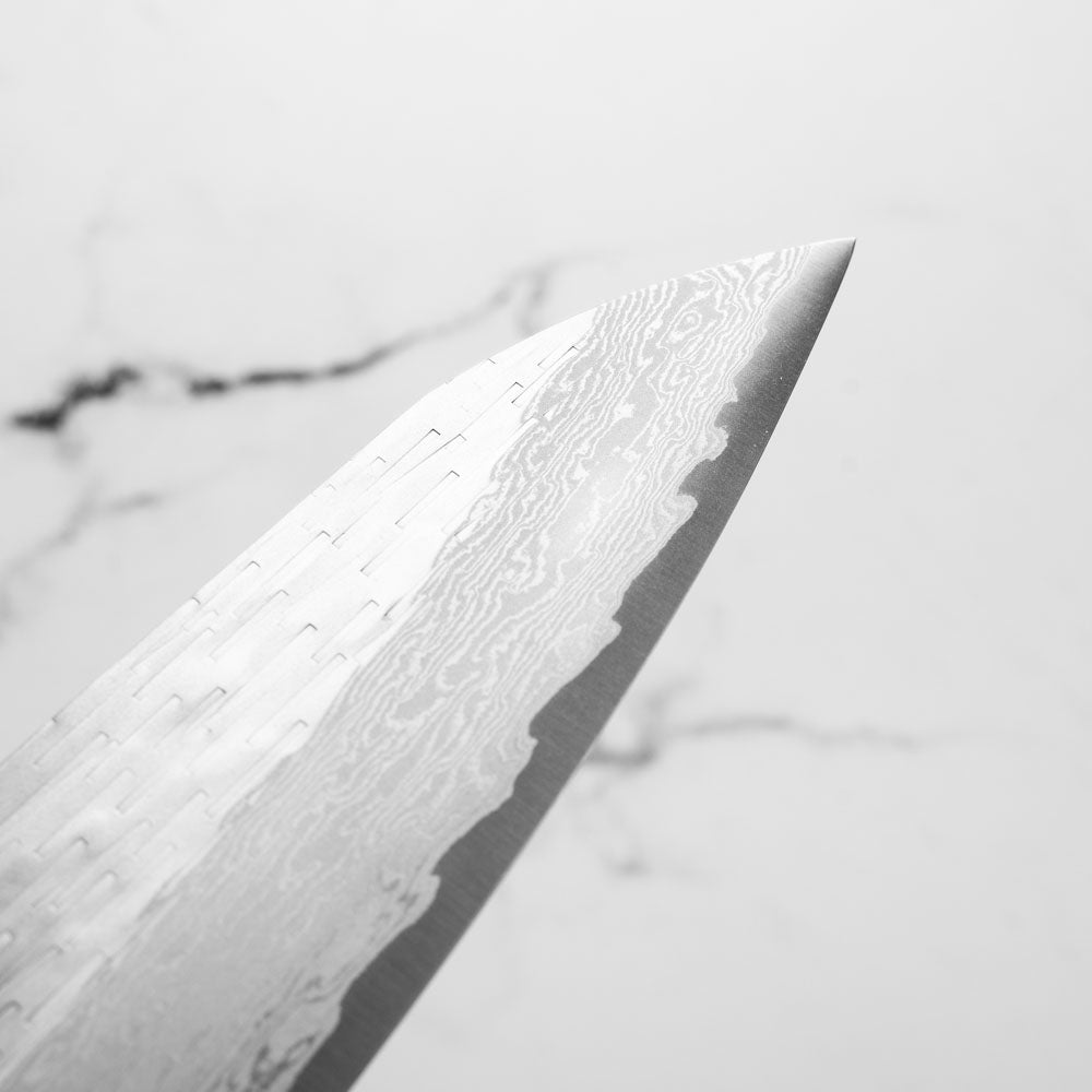 Nigara Hamono are truly some of the most experienced knifemakers in Japan. Now on their 8th generation of blacksmiths, they are masters at stainless damascus forging and heat treatment. The Anmon Damascus we have available have a matte finish and are polished underneath, resulting in a brilliant visual contrast.
