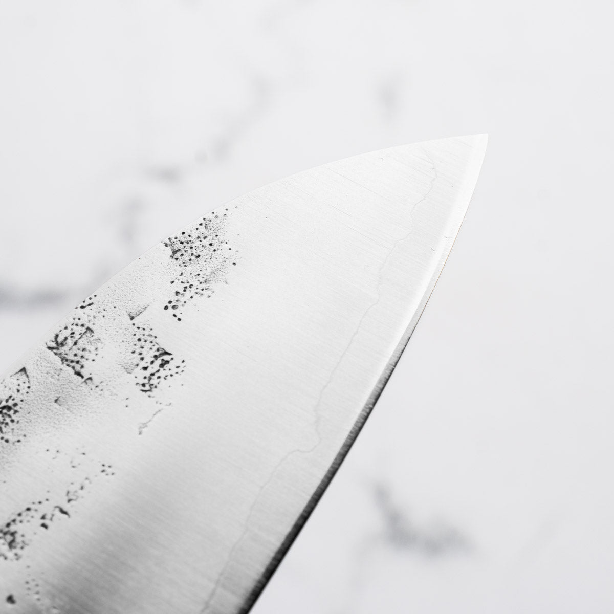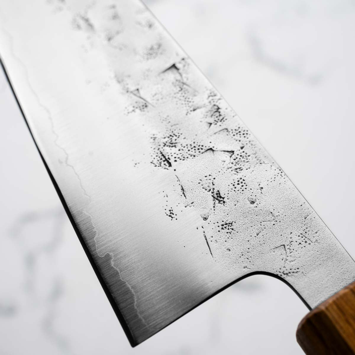 This knife is made from a high-carbon steel and as such, will require a little more care than a regular off-the-shelf knife. It must be dried shortly after use, as prolonged exposure to moisture can cause rust spots to appear. A very light coat of oil during storage also helps to prevent rust spots. A patina (colouration and seasoning of the steel) will occur with use.