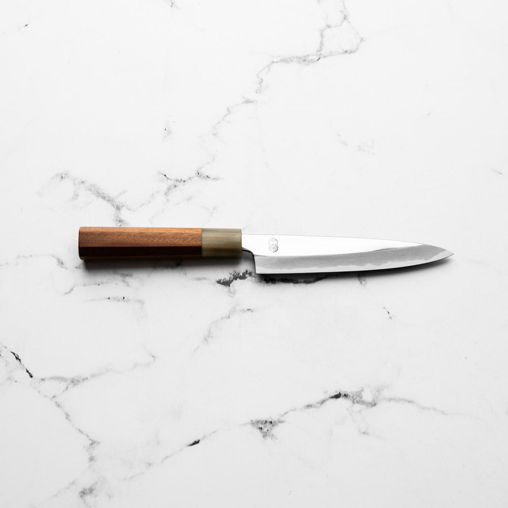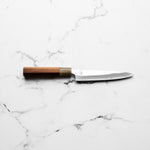 The Petty knife, a quintessential tool in Japanese cuisine, is a smaller utility knife used for precise, delicate tasks. Often considered a smaller sibling to the chef's knife, it excels in hand-held tasks like peeling, trimming, and intricate cutting. Its versatility makes it an essential for detailed culinary work.