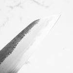 Japanese White Steel #2, a traditional high-carbon steel, is cherished for its purity and fine grain structure, enabling razor-sharp edges, at the cost of being reactive. It is one of the easiest steels to sharpen, but cannot be left wet for even short periods otherwise rust spots can occur. If you’re fastidious in your knife maintenance, this knife can steel can be extremely rewarding to use.