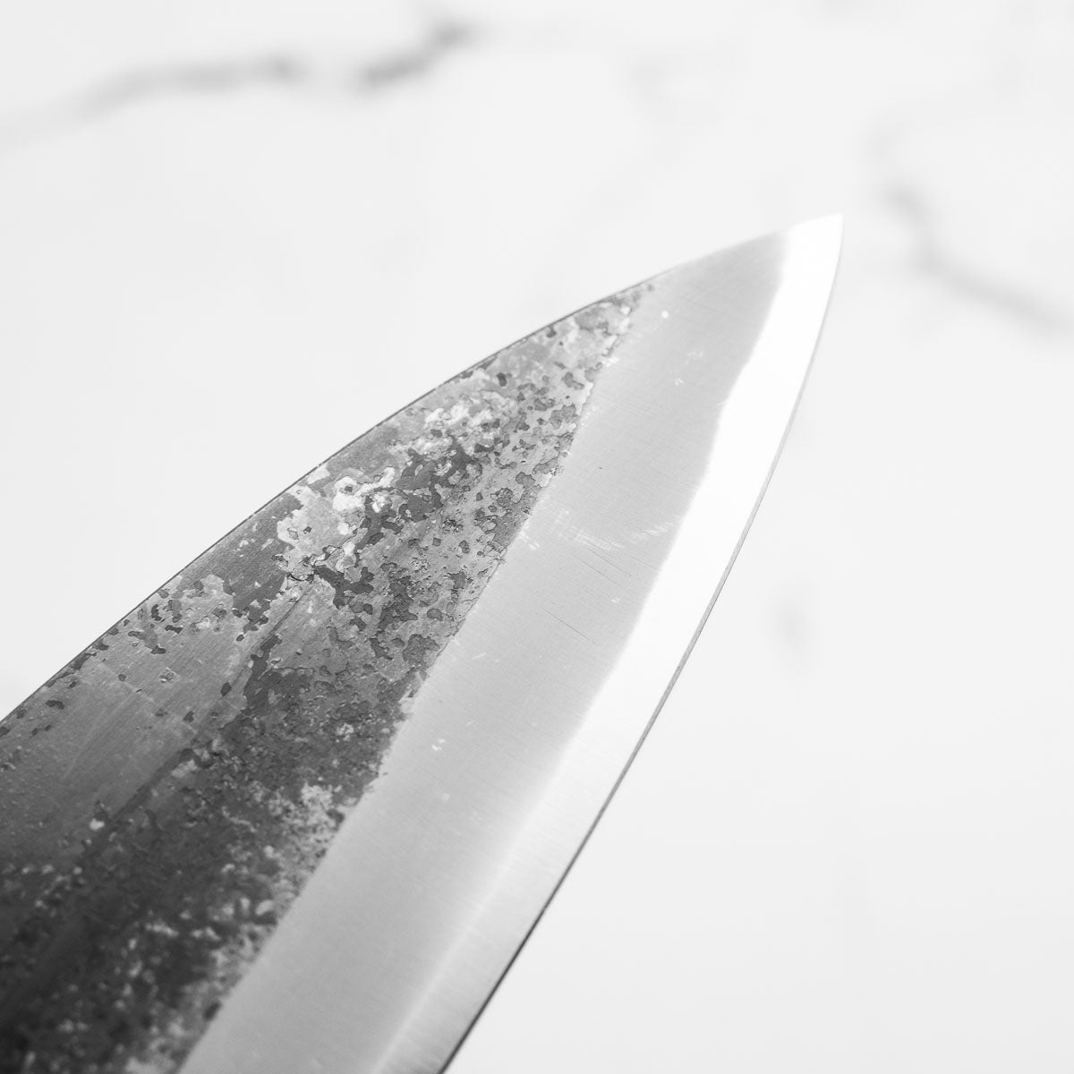 This knife is made from a high-carbon, semi-stainless steel and will be robust and resistant to rust. While it will not rust quickly like pure carbon, it is still best practice to not leave this knife wet for extended periods as it's stain-less, not stain-none! A light patina (colouration and seasoning of the steel) will still form over time.