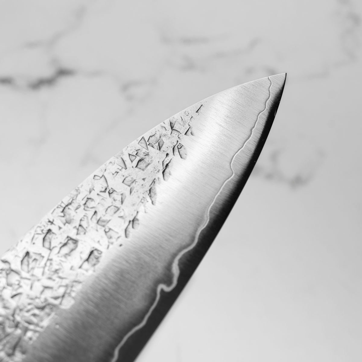 His knives are instantly recognizable for their striking Tsuchime and Suminagashi finishes, thin grinds, and use of high-performance steels such as SG2, HAP40, and stainless-clad Blue Super. Kurosaki’s Fujin series, with its dramatic wind-patterned hammer finish, helped cement his reputation as a blacksmith who blends artistry and technical brilliance in equal measure.